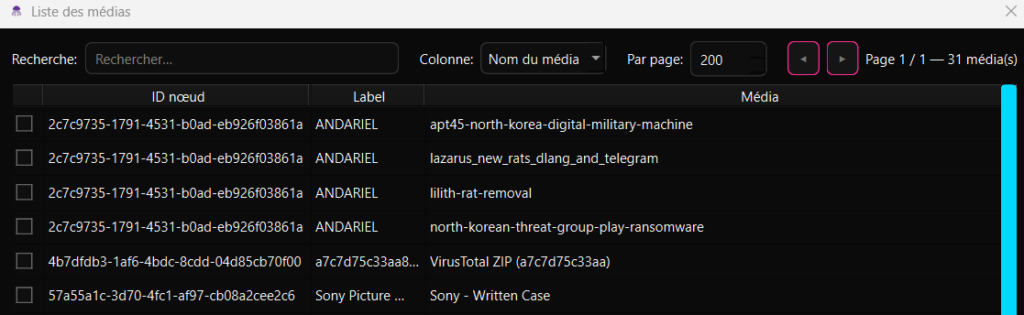 Chaque média possède des propriétés qui lui sont propres tels qu’un nom, une description, des tags, une date, un auteur et un hash sha256 comme cela est présenté ci-dessous: