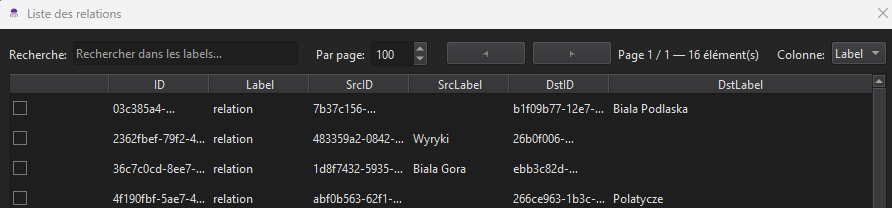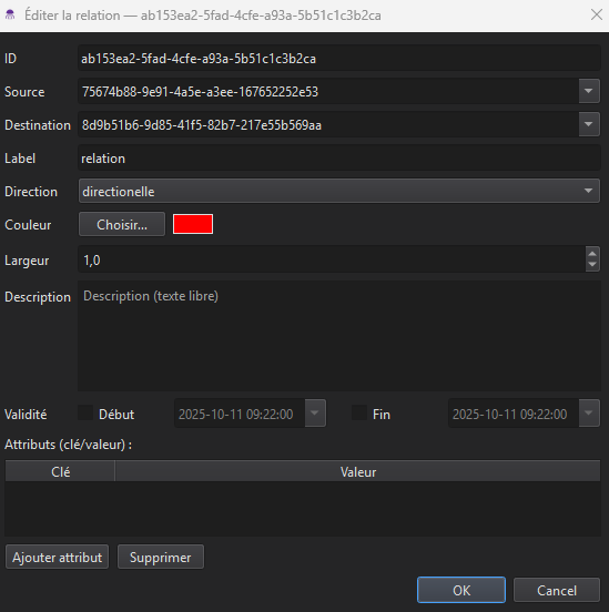 Tout comme les noeuds, il est possible de modifier les dates, le label, la couleur, la description ainsi que les attributs d’une relation. Il est par ailleurs possible de modifier le type de lien (flèche directionnelle, bidirectionnelle ou ligne pointillée), l’épaisseur ainsi que la couleur.