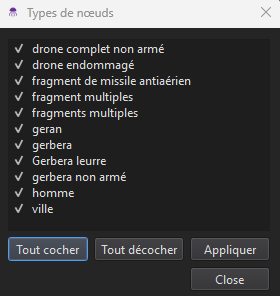 Un noeud est créé par un clic droit sur le fond de la scène. Chaque noeud possède une fiche qui lui est propre ainsi qu’un identifiant unique. Une fiche typique est présentée ci-dessous:
