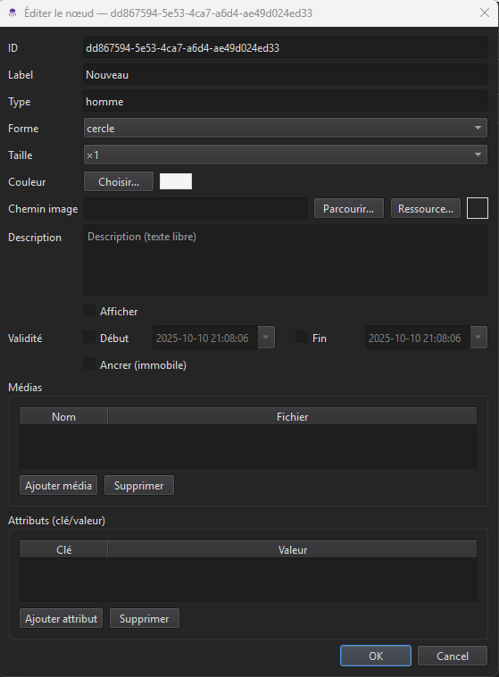 On y voit la possibilité de définir un label, ainsi qu’un type. Le label sera affiché sous le noeud lors de sa représentation sur la scène graphique. Il est possible de lui assigner une forme géométrique (ici, un cercle) et de définir sa taille ainsi que sa couleur. Chaque noeud possède un champ Description ainsi qu’une période de validité.